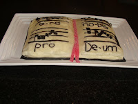 I’ve made a simple icing mixture for the whole cake and I then bought an inexpensive packet of liquorice straps (2 metres or 6.5 feet per packet) and I used clean scissors to cut the liquorice in order to make the book cover, chant notation and words. The book ribbons were made from some strawberry flavoured confectionery straps. So very simple!