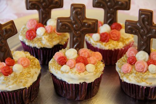 I haven't posted about them all yet, but this is another one of the "Saintly Symbol Cupcakes" that I came up with for Wreath IV of Little Flowers, in honor of St. Therese, decorating the cupcakes with gold sprinkles, mini candy roses, and a chocolate cross