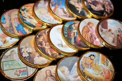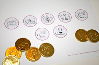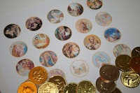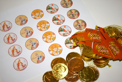 I cropped some of our favorite images of St. Nicholas to fit on the face of the large 1 1/2" Chocolate Coins (The bags of coins are available for $1.00 per bag at many grocery stores, including the Dollar Store, or you can purchase a 12 pack for $12.18 at Amazon