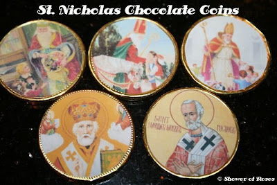For the past few years I have wanted to order the beautiful St. Nicholas chocolates I have seen online, but just haven't been able to spend the money (It all goes towards books, if you hadn't noticed! lol!) and have settled for repackaging the dollar bags of chocolates from the local grocery store. (You can see an example in last years post for the Feast of St. Nicholas.)