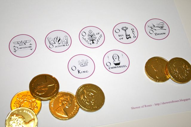 I made our Jesse Tree Coins using the smaller 1" coins. These would be a great alternative for ornaments (to go along with the readings and coloring pages) for a Jesse Tree if you attached a small piece of ribbon to hang them with and then they could be enjoyed on Christmas! I think I will add the set I made to this year's Jesse Tea.