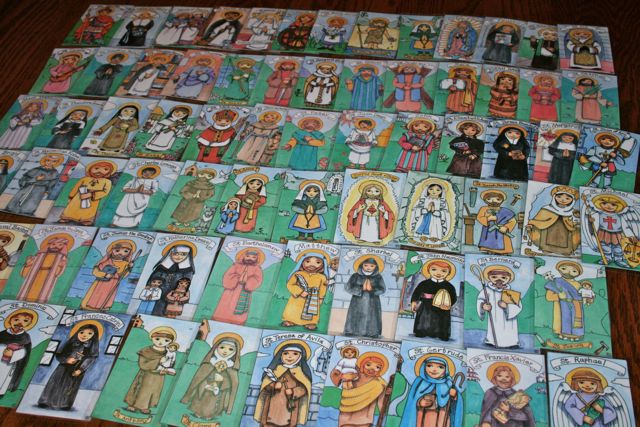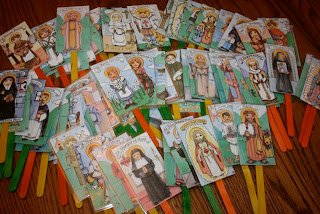 Various Laminated Saint Holy Cards  (I used the images and template from the Faith Keepers CD - which home educators can purchase for 50% off - from Catholic Artworks and then laminated the cards myself.)   Another option would be the Happy Saints or Shining Light Doll Printables