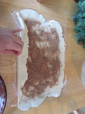 7. Combine the filling ingredients. Sprinkle evenly over dough. Use the plastic wrap to roll the dough. Slice the log into 10-12 slices. Lay the slices touching in your greased round pie pan. Bake 20 minutes. Frost while warm.