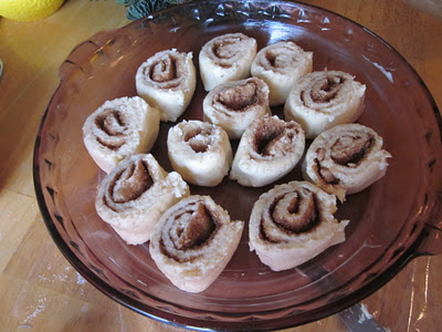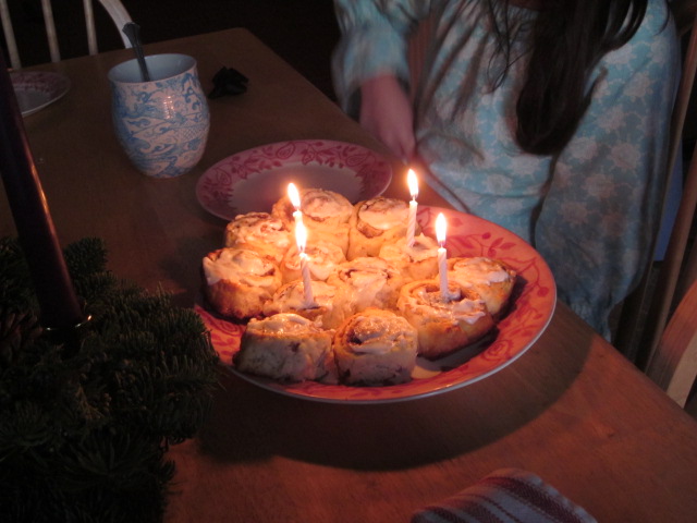 Here they are unbaked, tucked into the pan. Sorry I don't have a luscious baked picture...we will bake them early tomorrow morning, for the feast of St. Lucy. Then we'll spread them with frosting, too! Kids are having carrot sticks, poached chicken, and celery for dinner to balance all the sugar coming in the morning! (Updated to add additional pictures of the baked cinnamon rolls. Thank you Jeannine!)