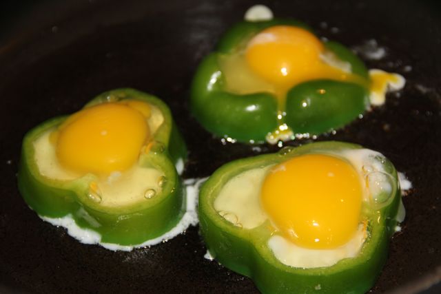 Crack one egg into each pepper ring. Cover and cook for a few minutes, until egg yolks are to desired firmness. If you like your yolks firm, it helps to break the yolk right after cracking into pepper rings.