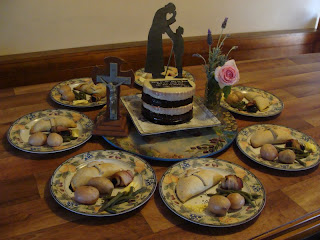 We kept the table setting austere, with no table cloth, in keeping with the simple and mortified life of the Cure.
