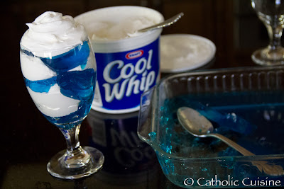 Peel your peach and slice thinly. Cube up your cake into bite size pieces. Then just layer it all together: cake, whipped cream, blueberries, whipped cream, and use several slices of your peach for Mary's crown. Simple, simple.