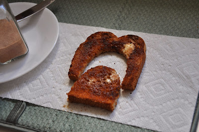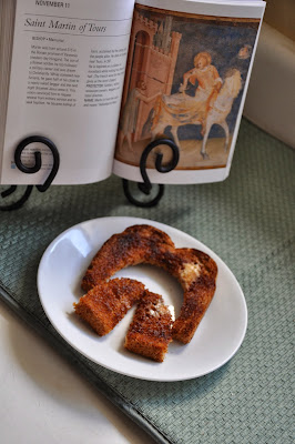 I came up with this idea this morning not intending to blog it but my kids really liked it, so I'm sharing it with you. The story of St. Martin of Tours is that when he was a soldier, he came upon a beggar outside of the city gates who was in need of clothing and warmth. St. Martin, having nothing else to offer, took off his beautiful cloak and cut it in two giving half to the beggar to keep him warm. Later that night, St. Martin had a dream that the beggar man was really Jesus and he was commending St. Martin for his generosity to the angels in Heaven. In honor of that story, I made these cinnamon toast treats to look like gates and cloaks. My oldest daughter commented though that if you turn the gate upside down, it resembles a horseshoe, which is also one of St. Martin's symbols. Either way, it is simple to make.