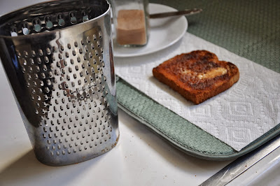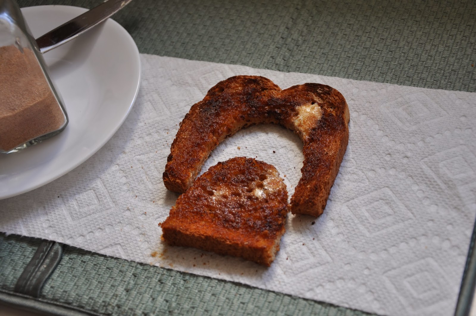 First, make some cinnamon toast. We like to toast the bread in the toaster, butter it and then sprinkle on the cinnamon sugar.